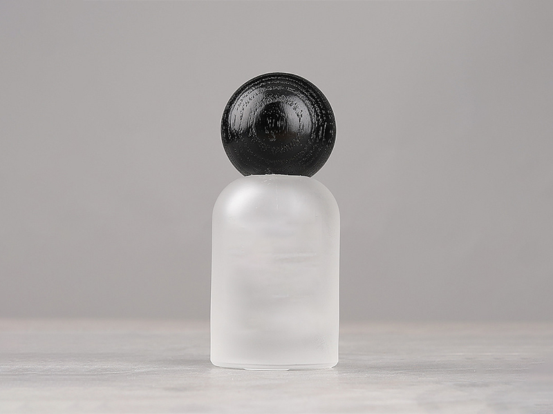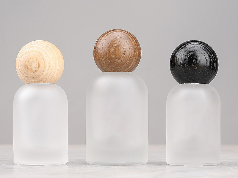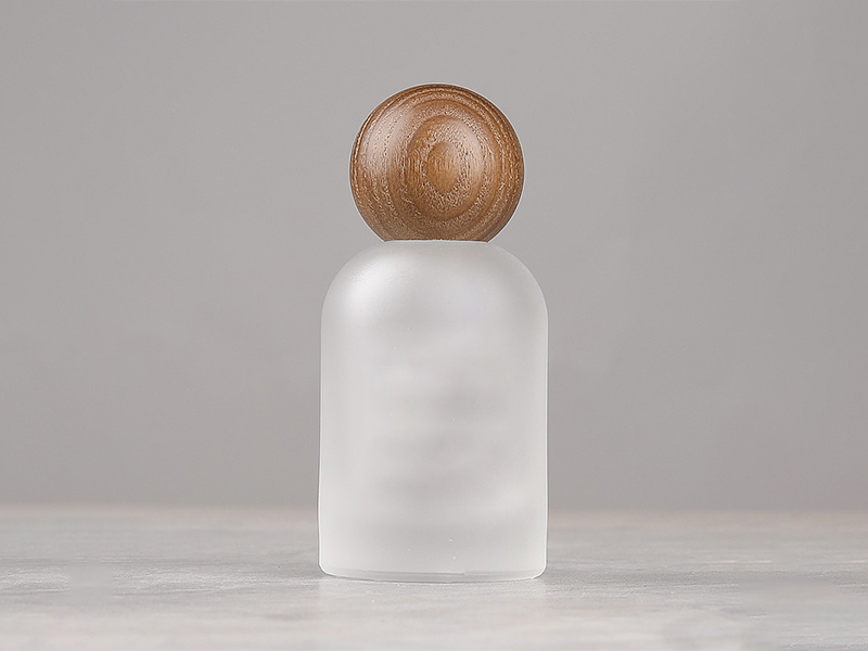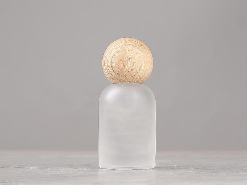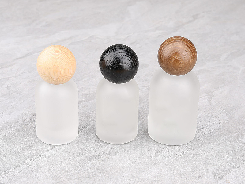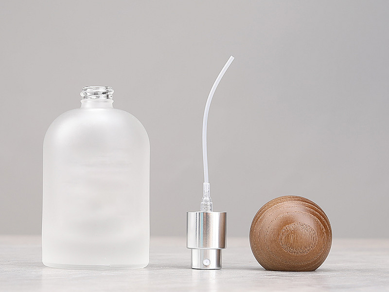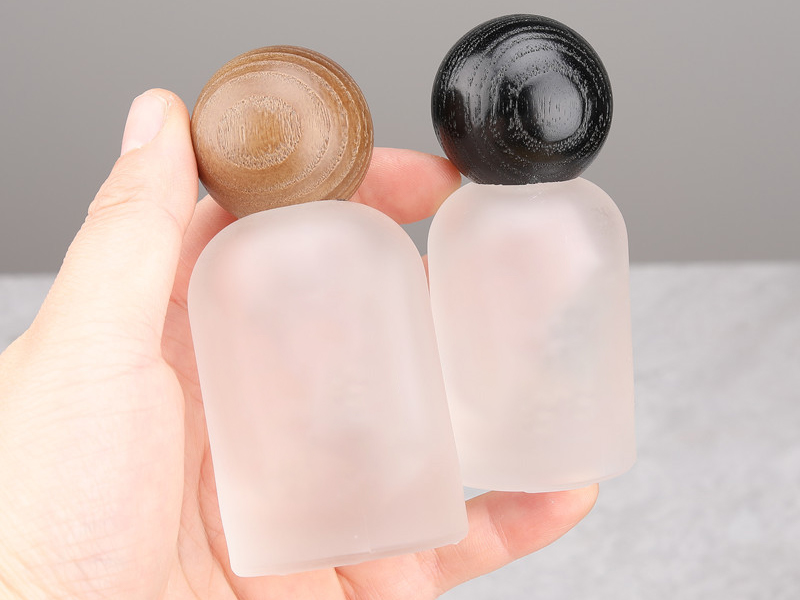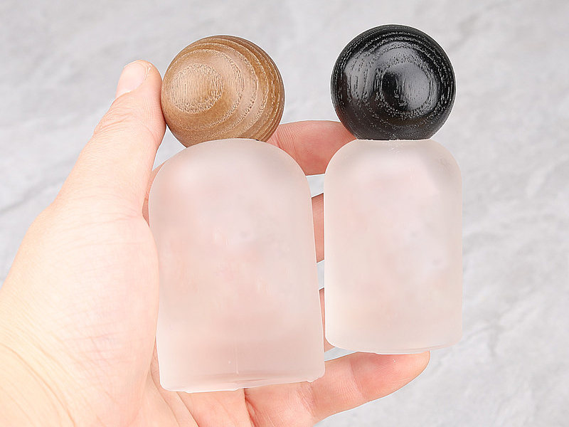 Custom Label Bell Shaped Cosmetic Packaging Press Pump Spray Bottle Frosted Glass Empty Perfume Spray Bottle with Walnut and Beech Wooden Cap