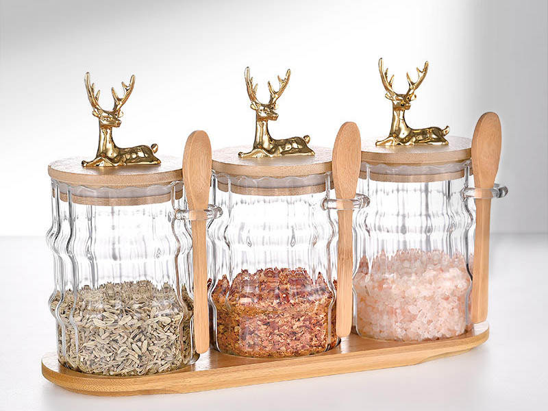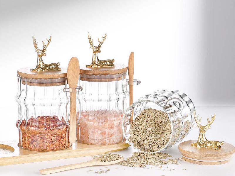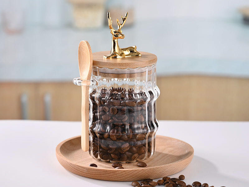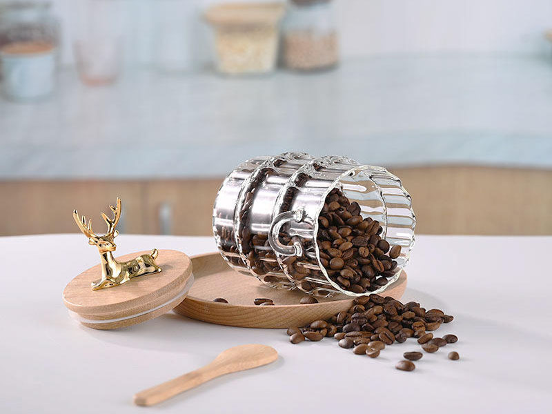 Wholesale Creative Stripe Clear Glass Tea Canister Round Food Sealed Jars Container Grain Spice Storage Box Kitchen Airtight Storage Glass Jar with Elk Decoration Bamboo Lid